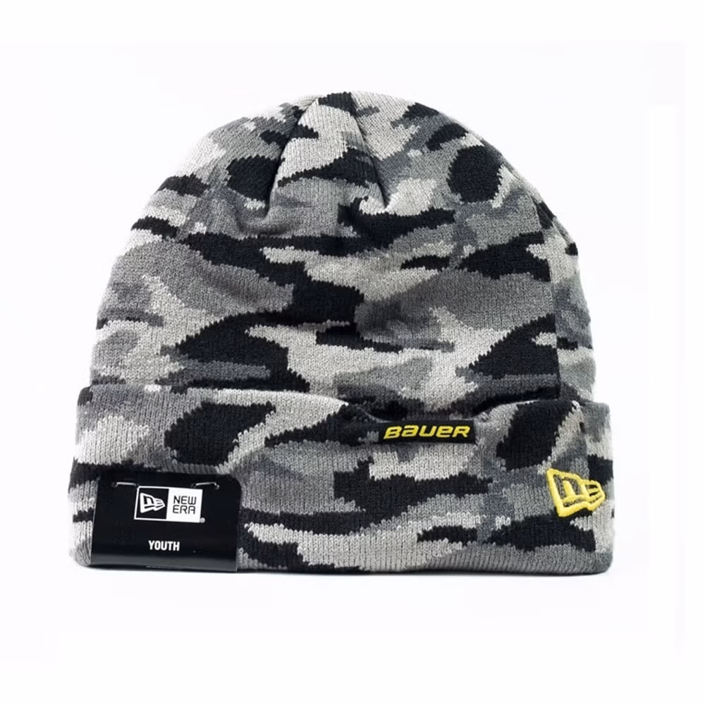 Bauer NEW ERA CAMO PATCH BEANIE is designed to be comfortable, and also to keep you warm during the cold months. It features the classic Bauer logo on the front cuff. New Era® embroidery on left side. Material 100% Acrylic. Size Youth, One Size Fits All.